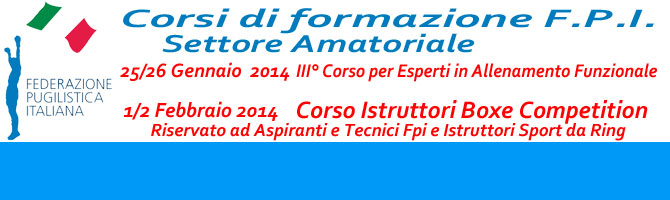 La continua richiesta di Istruttori qualificati, per la pratica delle Attività Amatoriali F.P.I. nelle palestre specializzate e nei centri di Fitness, ha sollecitato l’esigenza di un corso riservato ad Allenatori ed Istruttori di Sport da Combattimento, Aspiranti e Tecnici F.P.I. con pregressa esperienza, per prendere la Qualifica di Istruttore di Boxe Competition. Il Corso intende fornire le conoscenze di base per la gestione, l’organizzazione e la programmazione dell’allenamento nella Boxe Competition. Sono previste 12 ore di formazione con le seguenti materie: